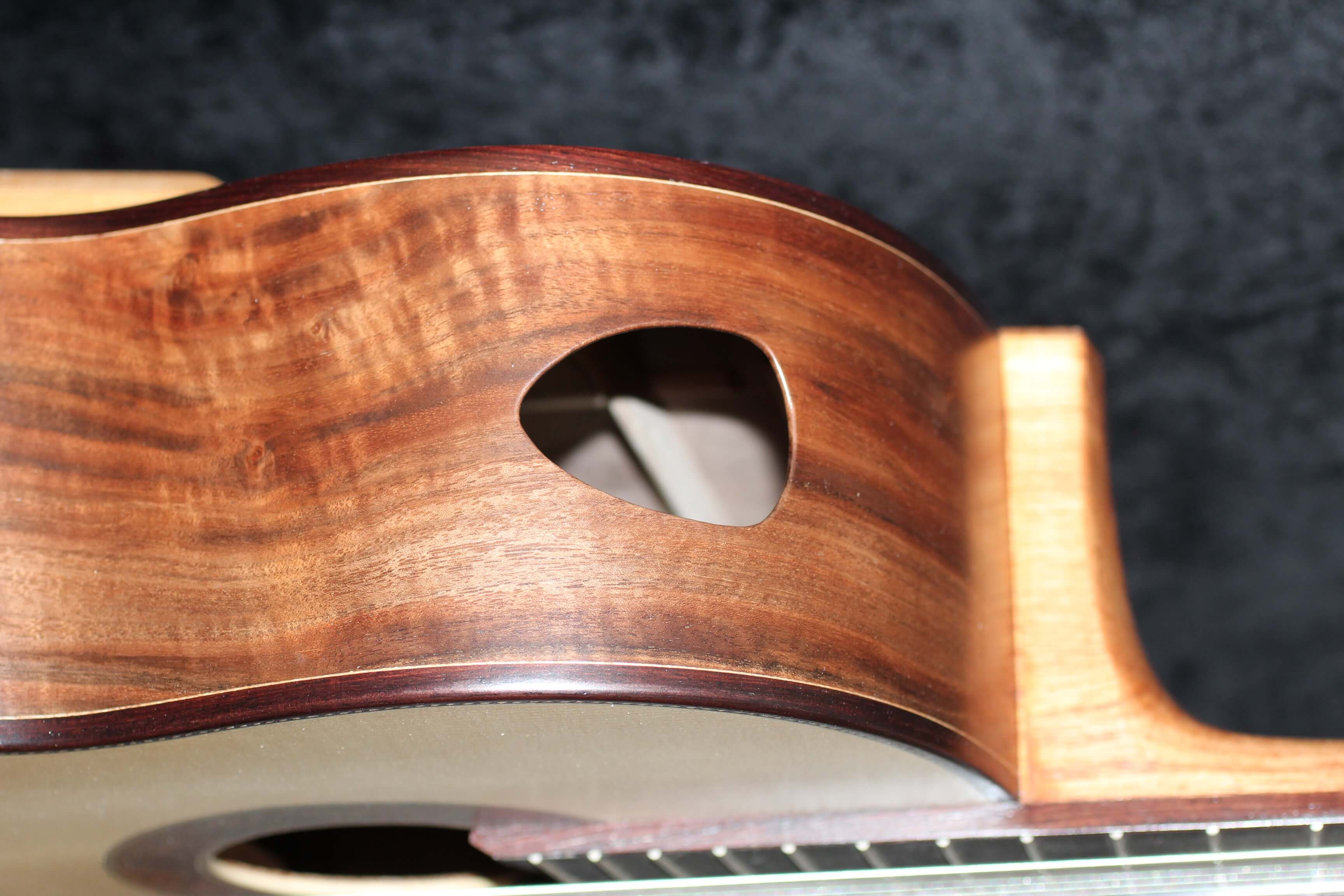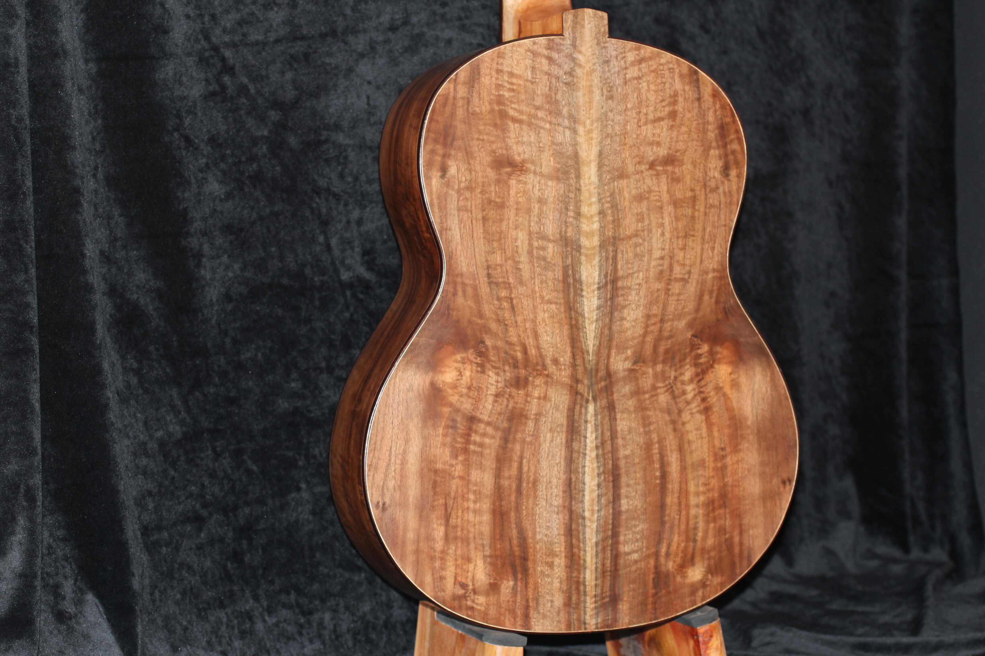 El mundo de la guitarra clásica es por lo general bastante conservador. Las primeras guitarras que construí a pedido fueron creadas usando especies tropicales para fondo y aros, que se vienen utilizando en guitarrería desde el siglo XIX. Lo cierto es que las especies más tradicionales, como el palisandro de Río (también llamado jacarandá de Bahía) o la caoba se empleaban en España en el siglo XIX porque eran maderas que se utilizaban en ebanistería y carpintería fina en esa época, y no exclusivamente por sus cualidades sonoras. Numerosos estudios contemporáneos sobre el uso de especies alternativas en la construcción de instrumentos ponen en evidencia que la calidad sonora que puede lograrse empleando especies no tropicales no es inferior a la que se logra con especies usadas tradicionalmente. Es por esto que en los últimos años he empezado a utilizar (para fondo y aros, y también para diapasones y otros componentes) cortes de árboles recuperados de mi ciudad, así como madera autóctona de nuestro país y región. Entre otras especies, he empleado guayubira, ciprés, acacia robinia, acacia visco, olivo, paraíso y petiribí. El resultado sonoro ha sido muy positivo, aunque aún queda mucho por experimentar en este campo.